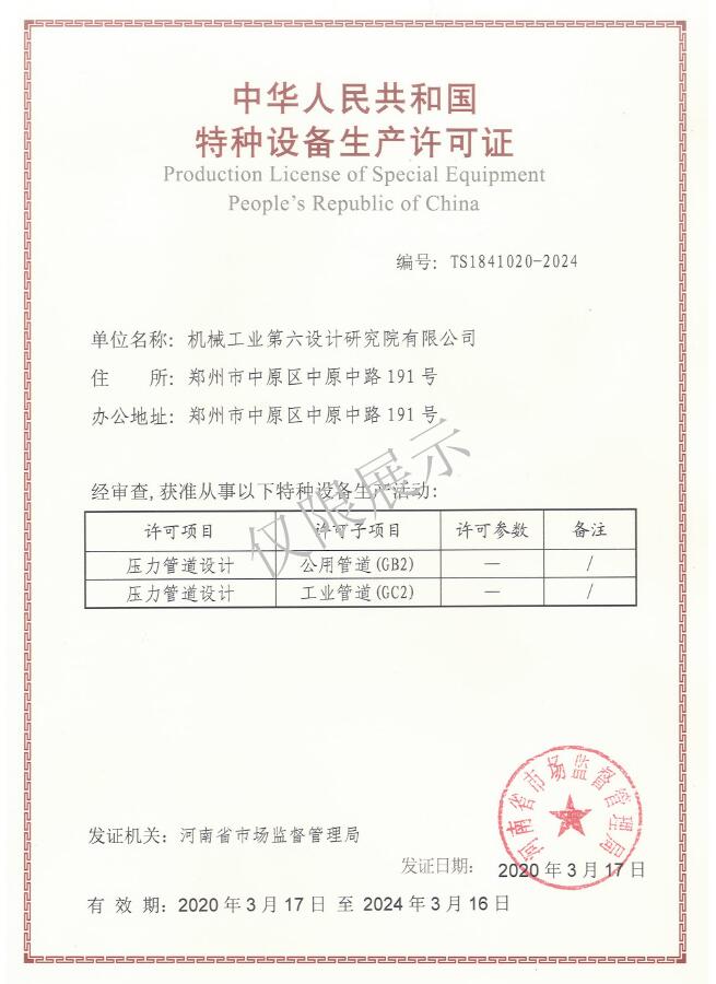 中華人民共和國(guó)特種設(shè)備設(shè)計(jì)許可證(壓力管道)